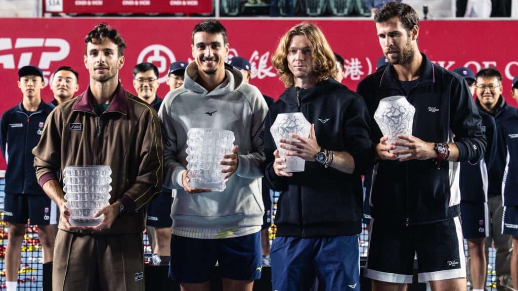 Лоренцо Музетти, Лоренцо Сонего, Андрей Рублев и Карен Хачанов с трофеями парного разряда турнира Bank of China Hong Kong Tennis Open-2026 / Фото: hkmenstennisopen.com