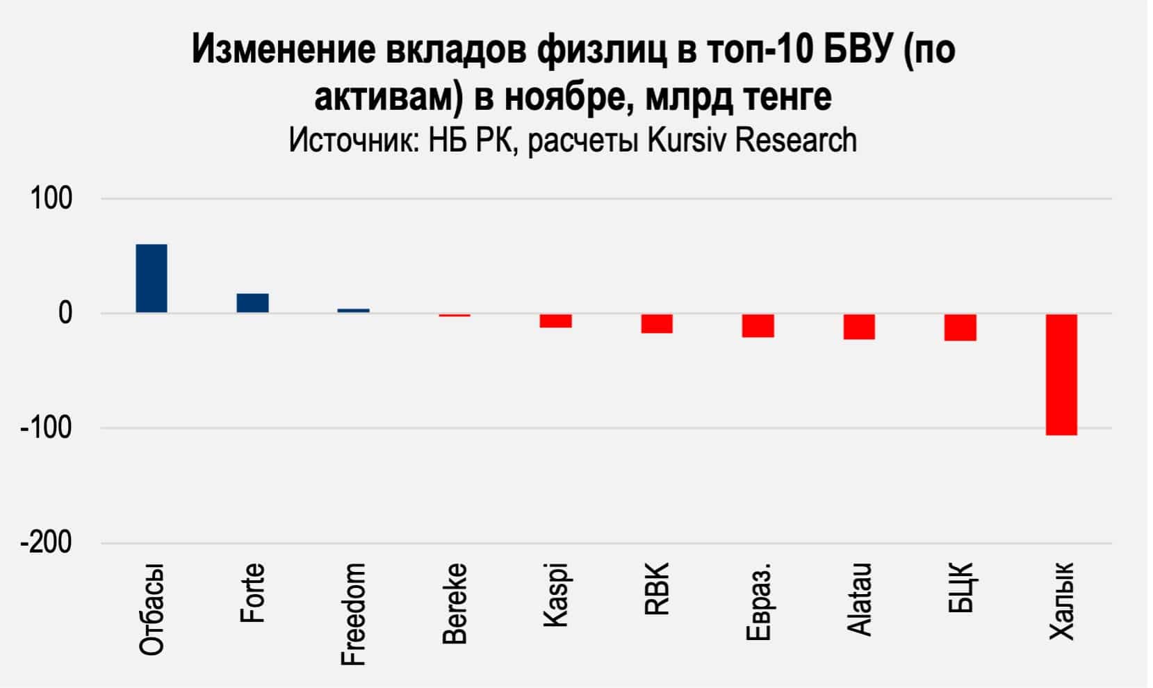 Номинальный рост вкладов в ноябре показали лишь три банка из первой когорты. Лидером месяца стал жилищно-сберегательный Отбасы (+60 млрд), который из-за своей бизнес-модели не конкурирует за деньги вкладчиков. Со значительным отставанием от него расположился Forte (+17 млрд), с символическим плюсом отчетный месяц закрыл Freedom (+4 млрд).
