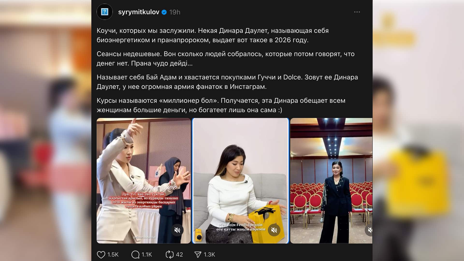 В своих публикациях Даулет заявляет, что ее ученики якобы зарабатывают миллионы тенге, избавляются от долгов и «меняются до неузнаваемости». Стоимость таких курсов и сеансов при этом, по словам пользователей, немаленькая.