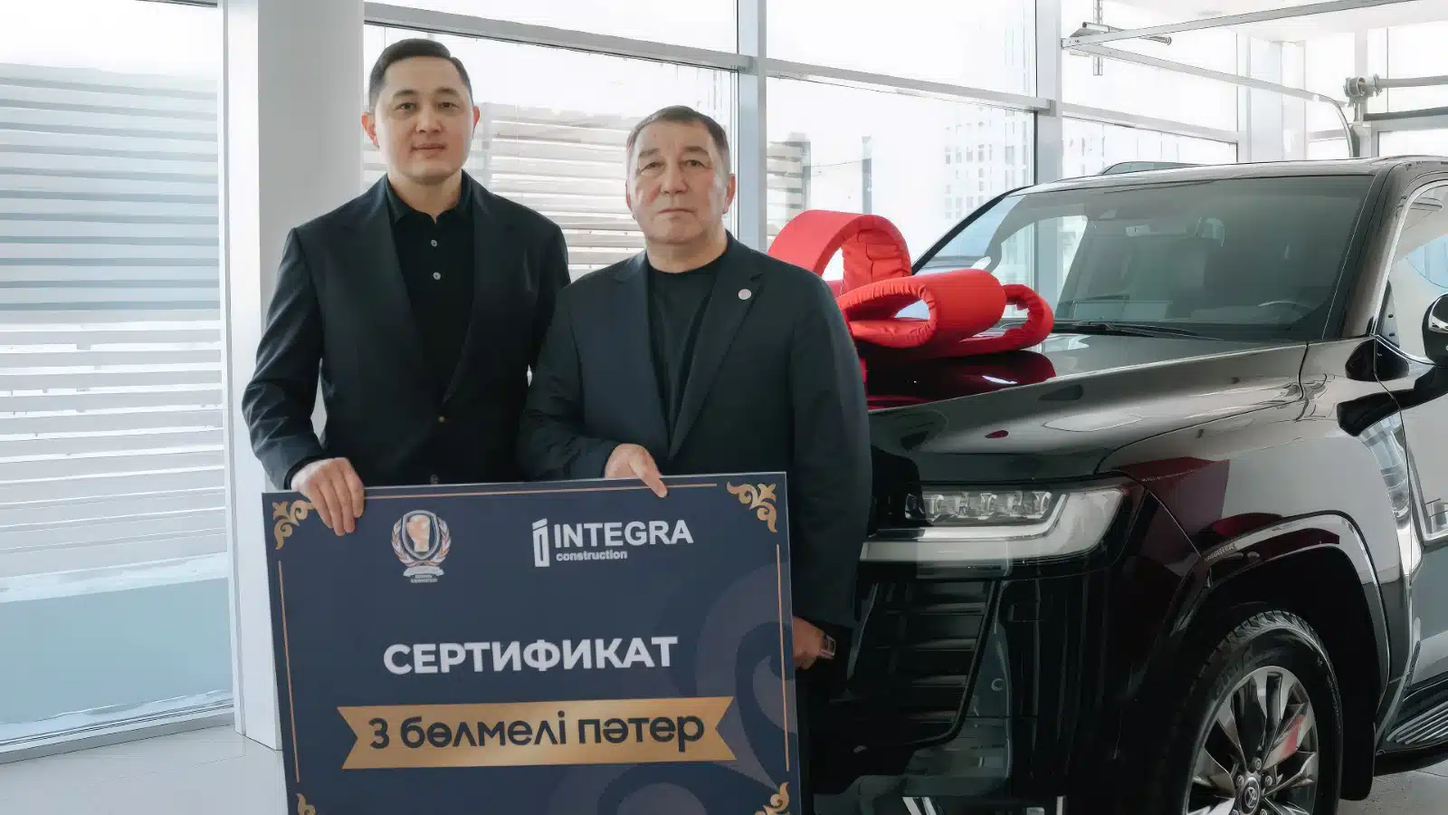 Из рук первого вице-президента федерации Дархана Кызайбаева Сатжанов получил ключи от трехкомнатной квартиры в Астане, а также автомобиль Toyota Land Cruiser 300, стоимость которого начинается от 52 млн тенге.