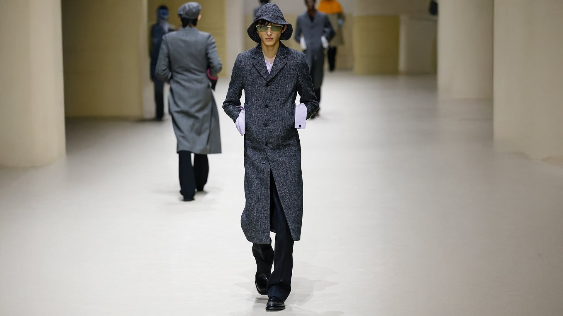Коллекцию для этого показа разработали Миучча Прада и Раф Симонс. На подиуме Данияров примерил образ из классических брюк, рубашки и длинного пальто с шляпой в тон.