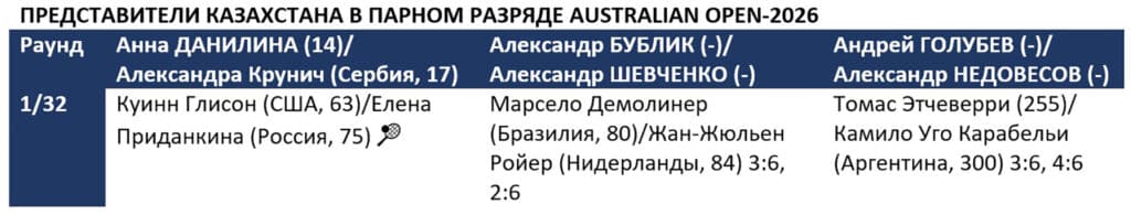 Третий день АО-2026, первого турнира «Большого шлема» в календарном году, начался с потерь для Казахстана. Тандемы Андрей Голубев/Александр Недовесов и Александр Бублик/Александр Шевченко, проиграв в первом круге, завершили выступления в парном разряде.