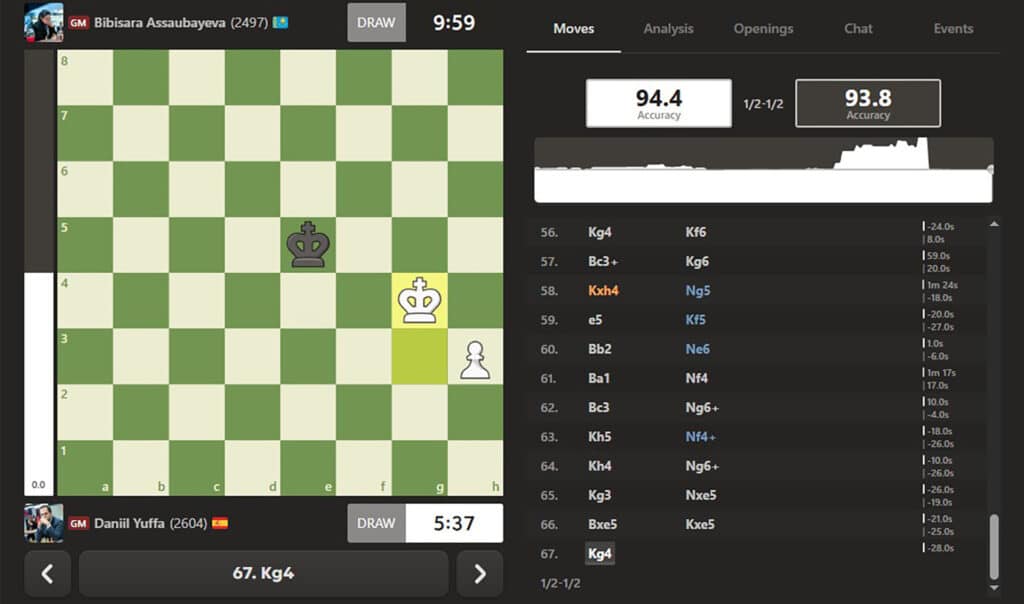 После победы на старте трехкратная чемпионка мира по блицу трижды сыграла вничью. В четвертом туре у Асаубаевой были черные фигуры. Вместе со своим оппонентом, уроженцем Тюмени, переехавшим в Испанию, они доигрались до практически голых королей. И на 67-м ходу заключили мир.