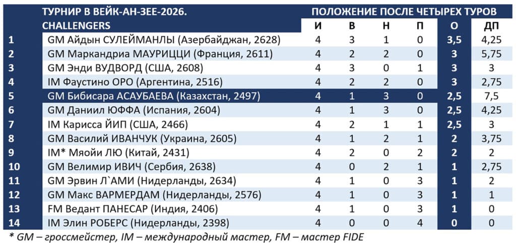 На легендарном шахматном турнире в нидерландском Вейк-ан-Зее пройдена почти треть дистанции. Казахстанский гроссмейстер Бибисара Асаубаева, сыграв вничью с Даниилом Юффой, занимает пятое место.