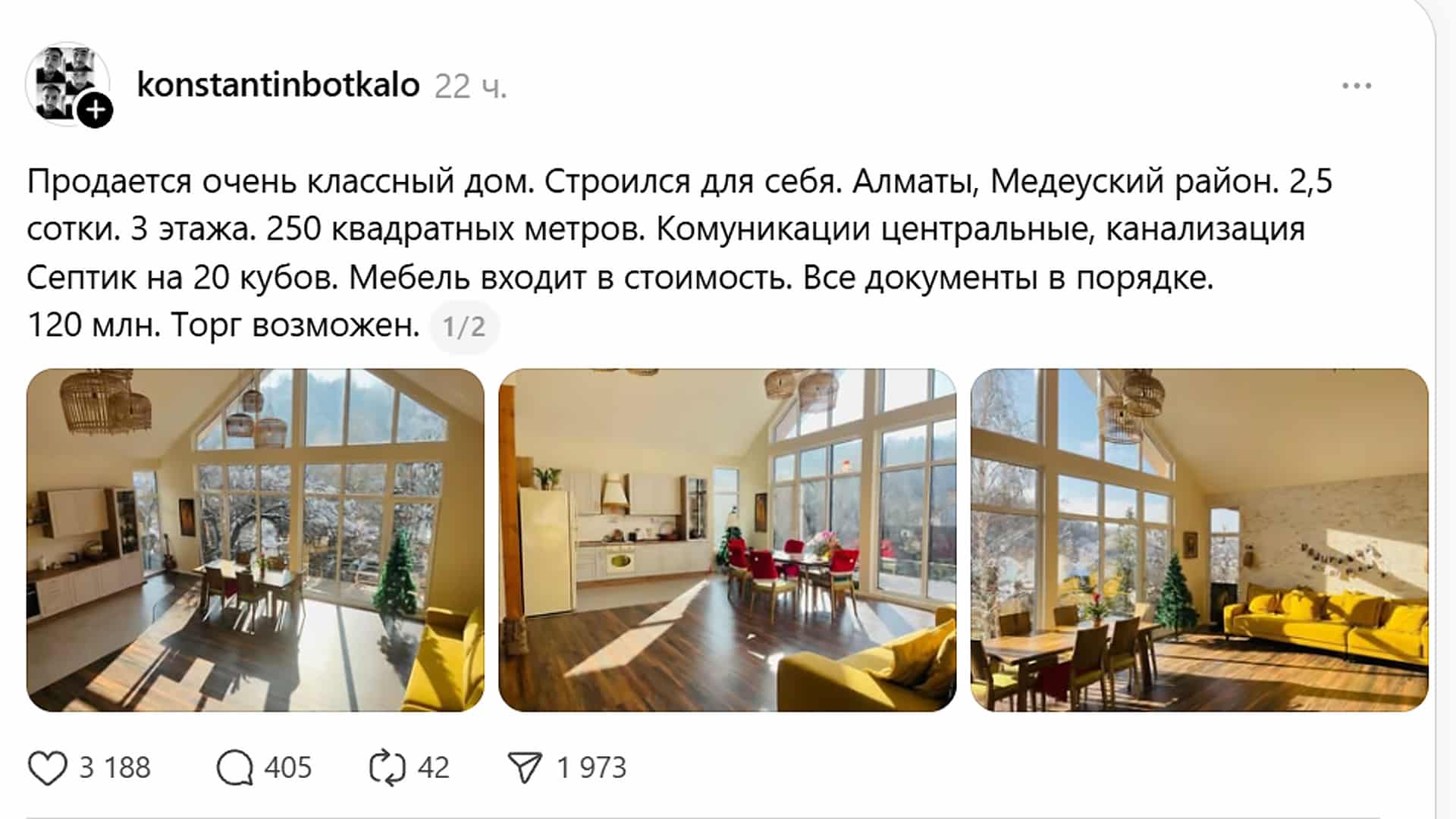 В Threads внезапно взлетел пост о продаже дома в Медеуском районе Алматы. Люди в комментариях влюбились с первого фото.