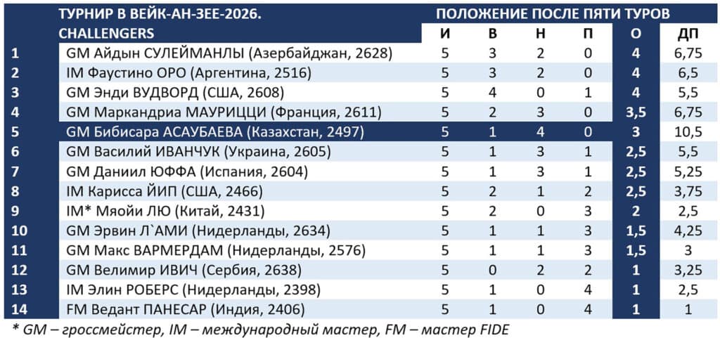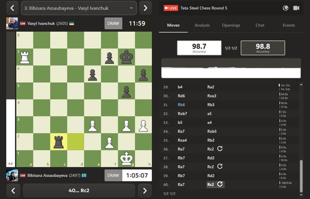 21-летний гроссмейстер Бибисара Асаубаева в пятом туре престижного турнира в голландском Вейк-ан-Зее завершила миром партию с 56-летним шахматным мэтром Василием Иванчуком с Украины.