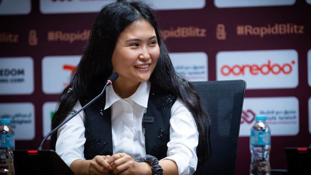 Казахстанская шахматистка Бибисара Асаубаева на пресс-конференции / Фото: tatasteelchess.com