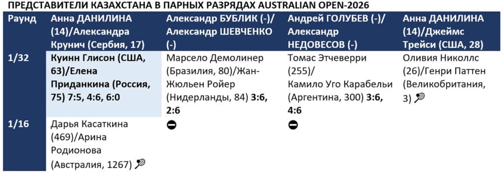 Накануне на АО-2026 Казахстан потерял третьего представителя в одиночном разряде. Вслед за Дмитрием Попко и Зариной Дияс турнир покинул Александр Шевченко. Борьбу в Мельбурне продолжают Александр Бублик и Юлия Путинцева, вышедшие в третий круг, а также Елена Рыбакина. Сетка юниоров будет обнародована позже.
