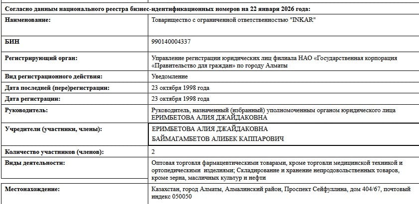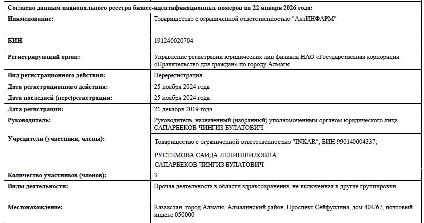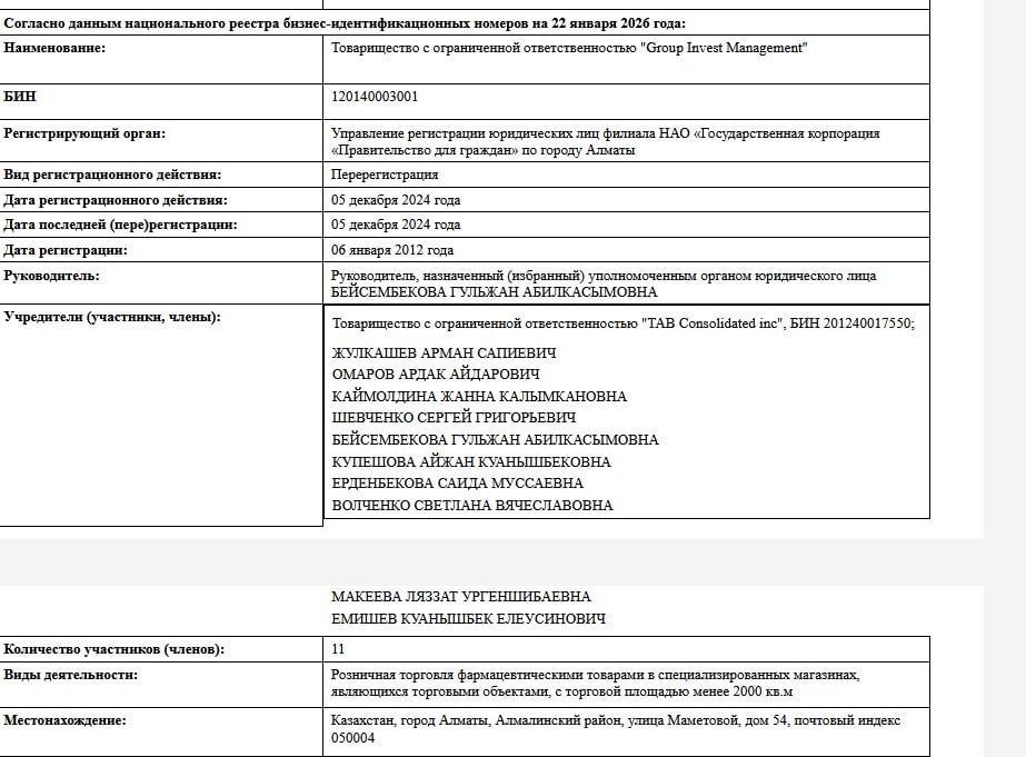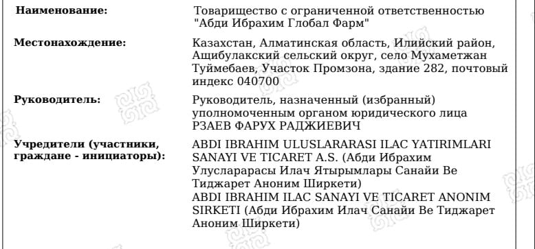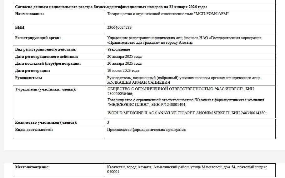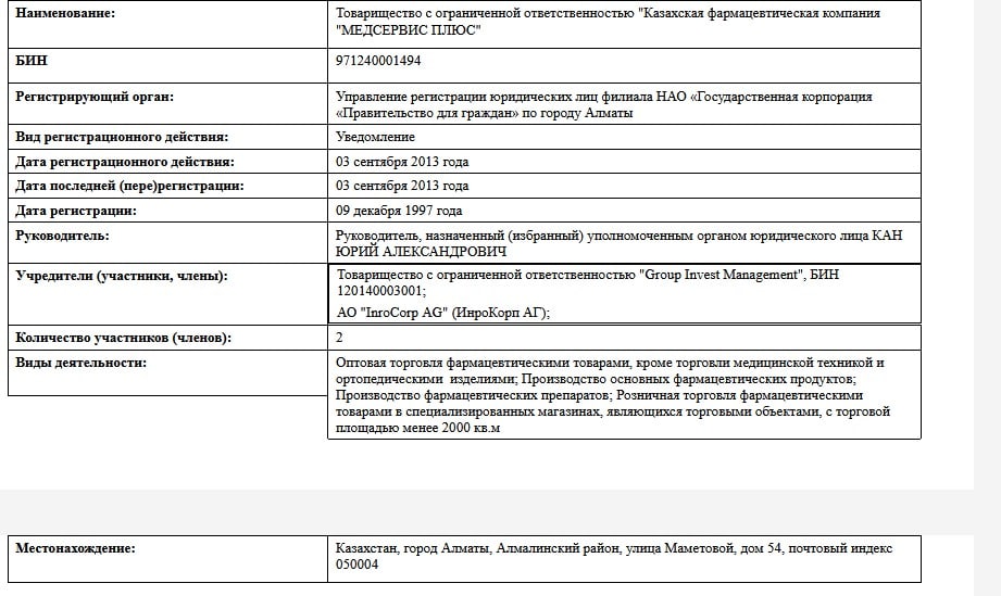 Учредители включают сложную цепочку: ТОО «ФАС Инвест», ТОО «Казахская фармацевтическая компания «МЕДСЕРВИС ПЛЮС»» (с участием ТОО «Group Invest Management», эмиратской FOURAS PROJECT MANAGEMENT SERVICE L.L.C и физлиц вроде Жулкашева Армана Сапиевича, Омарова Ардака Айдаровича, Каймолдиной Жанны Калымкановны и других), а также АО «InroCorp AG» и World Medicine.