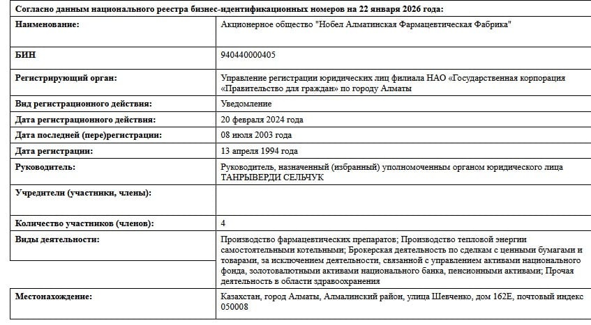 АО «Нобел Алматинская фармацевтическая фабрика» построит в Алматы комплекс по выпуску активных фармацевтических ингредиентов, лекарств и биопрепаратов по стандартам GMP. Инвестиции — 39,2 миллиарда тенге. Выпуск — 53 препарата (17 социально значимых). Партнер — Nobel İlaç (Турция). Минимум 200 новых рабочих мест.