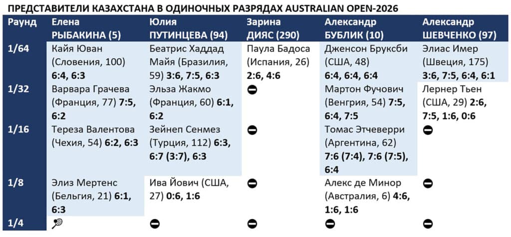 Первая ракетка Казахстана Елена Рыбакина (5), победив бельгийку Элиз Мертенс (21) 6:1, 6:3, вышла в четвертьфинал Australian Open, где может сыграть со второй ракеткой мира Игой Свентек из Польши.