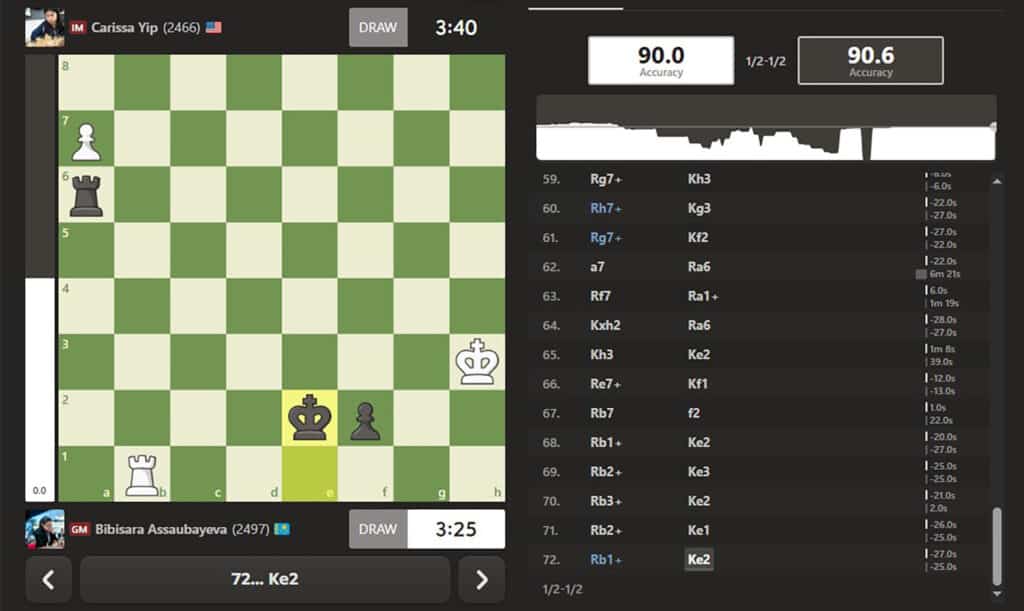 Большую часть партии трехкратной чемпионке мира по блицу пришлось защищаться. Ценой больших усилий Асаубаевой удалось уравнять сложный эндшпиль с лишней пешкой у соперницы. Соревнование «кто быстрее проведет пешку в ферзя» завершилось вничью.