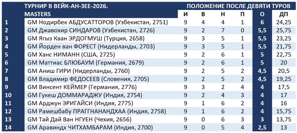 В девятом туре 15-летний гроссмейстер белыми победил 28-летнего уроженца Тюмени Даниила Юффу, выступающему за Испанию. На полбалла от вундеркинда отстает азербайджанец Айдын Сулейманлы, обыгравший аргентинца Фаустино Оро.