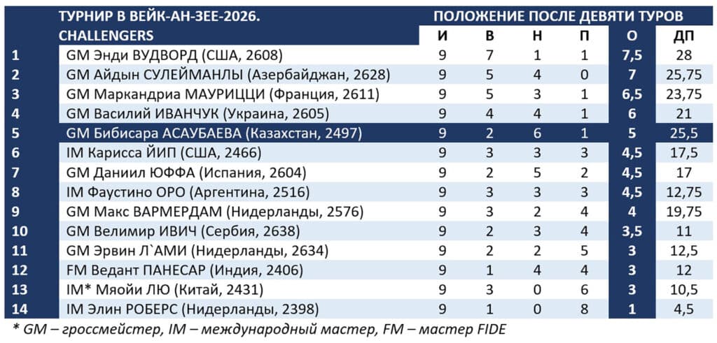В девятом туре супертурнира в голландском городе Вейк-ан-Зее Бибисара Асаубаева белыми не сумела сломить сопротивление Кариссы Йип. 21-летний гроссмейстер из Казахстана и 22-летний международный мастер из США заключили мир на 72-м ходу.