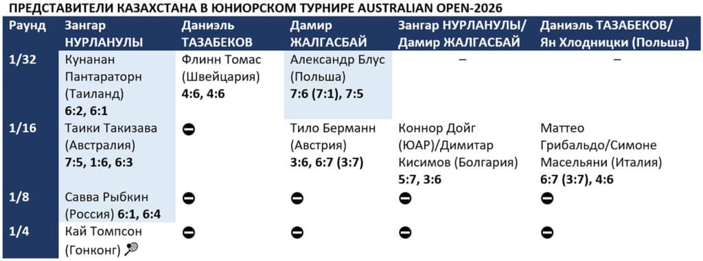 Казахстанец Зангар Нурланулы, победив россиянина Савву Рыбкина 6:1, 6:4, вышел в четвертьфинал юниорского турнира, проходящего в рамках Australian Open.