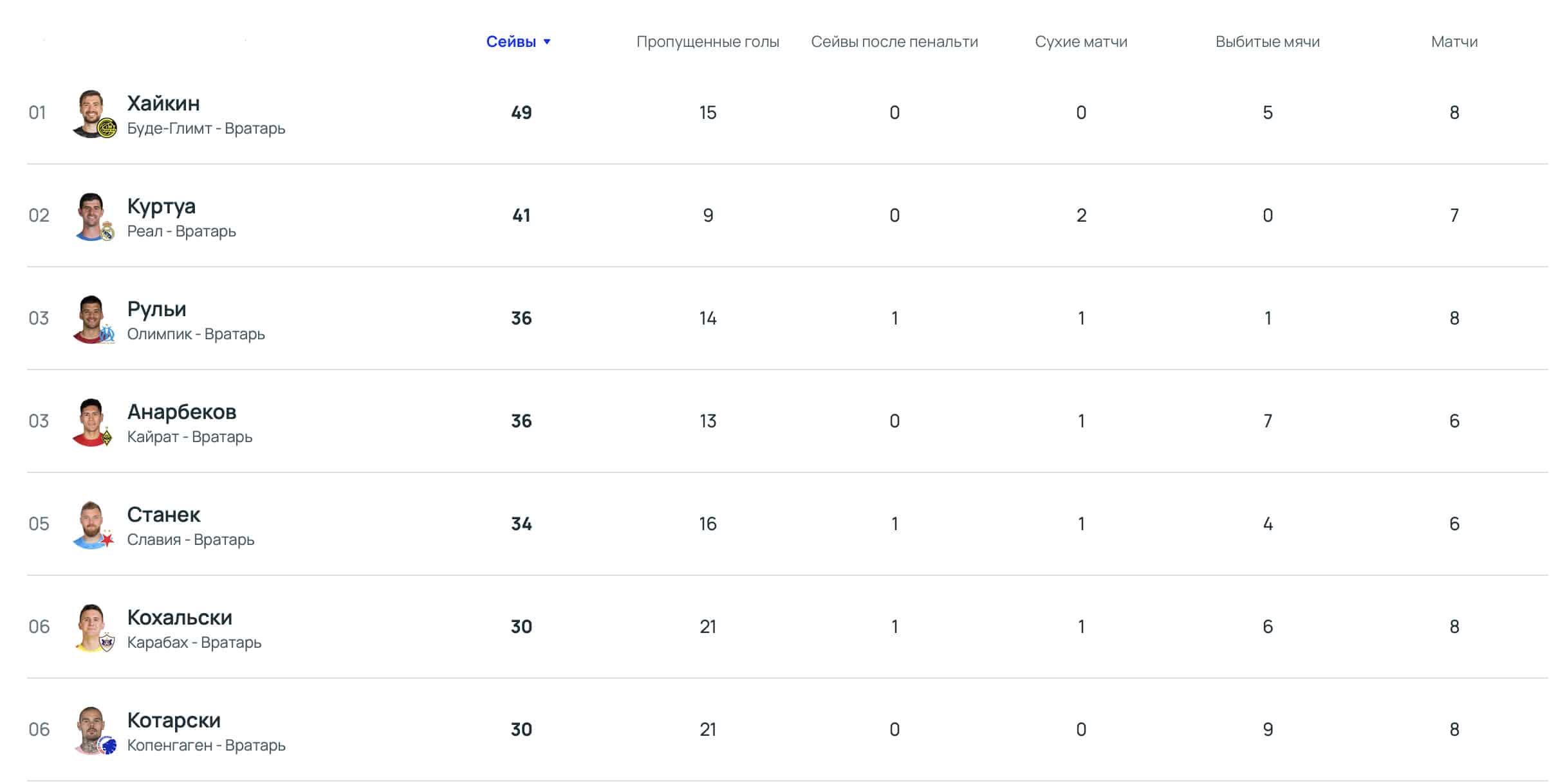 Лучшим вратарем по количеству сейвов стал Никита Хайкин из «Буде-Глимт». В его активе 49 отраженных ударов в восьми играх. На второй строчке рейтинга расположился Тибо Куртуа из «Реала» – 41 сейв в семи матчах.