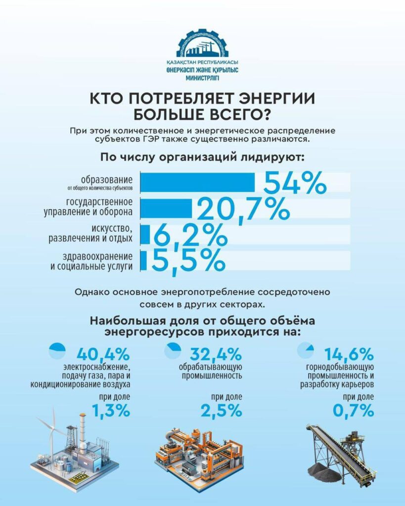 В Казахстане около 21 тыс. компаний и учреждений входят в Государственный энергетический реестр. Но больше всего энергии «сжигают» промышленные и энергетические предприятия, тогда как школы, больницы и госструктуры занимают лишь небольшую долю в общем потреблении.