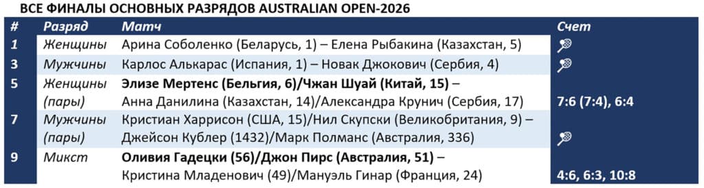 Игровой день на АО-2026 начался с финала в парном женском разряде. Казахстанско-сербская пара Анна Данилина/Александра Крунич уступили бельгийке Элизе Мертенс и Чжан Шуай из Китая – 6:7 (4:7), 4:6. Подробности взрослого мэйджора в Мельбурне здесь.