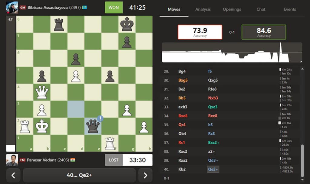 В заключительном туре трехкратная чемпионка мира по блицу, играя черными, на 40-м ходу принудила к капитуляции индуса Веданта Панесара.