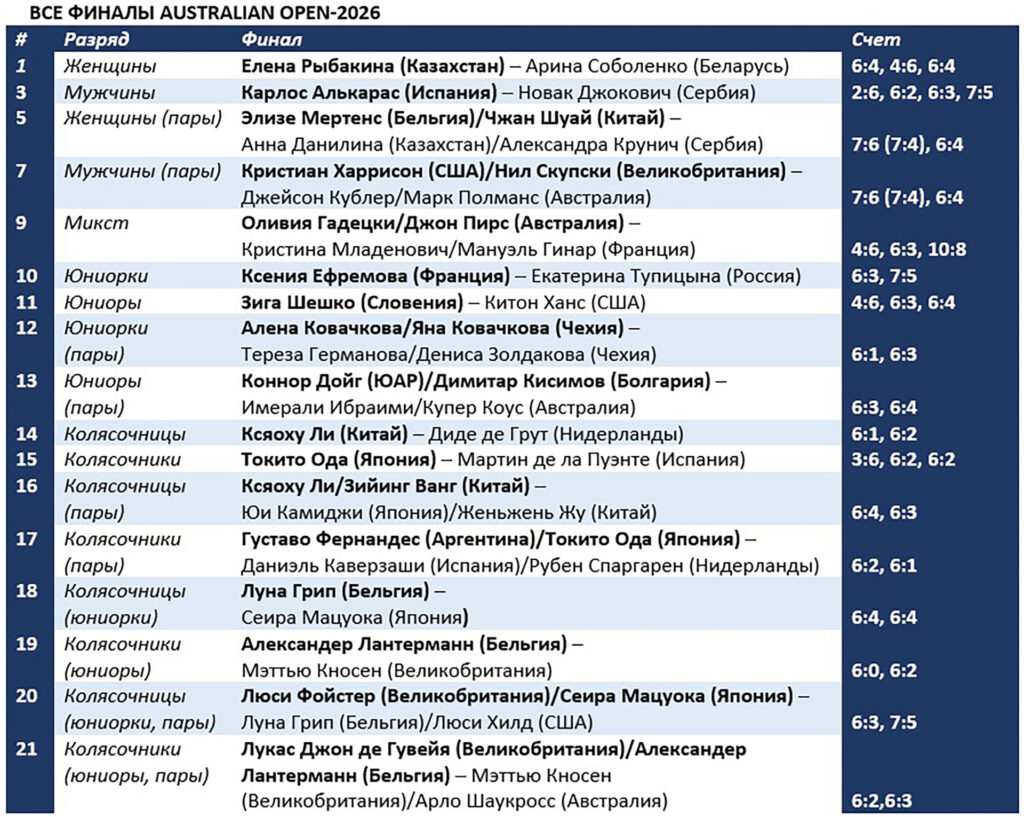 Мужской финал завершил программу АО-2026. Победители определились в 21-м разряде. Отметим триумф юношей Коннора Дойга и Димитара Кисимова. Южноафриканец с болгарином на старте турнира прошли нашу пару Зангар Нурланулы/Дамир Жалгасбай – 7:5, 6:3. А вот победитель Нурлынулы в одиночном полуфинале, американец Китон Ханс, проиграл решающий матч словенцу Зиге Шешко – 6:4, 3:6, 4:6.