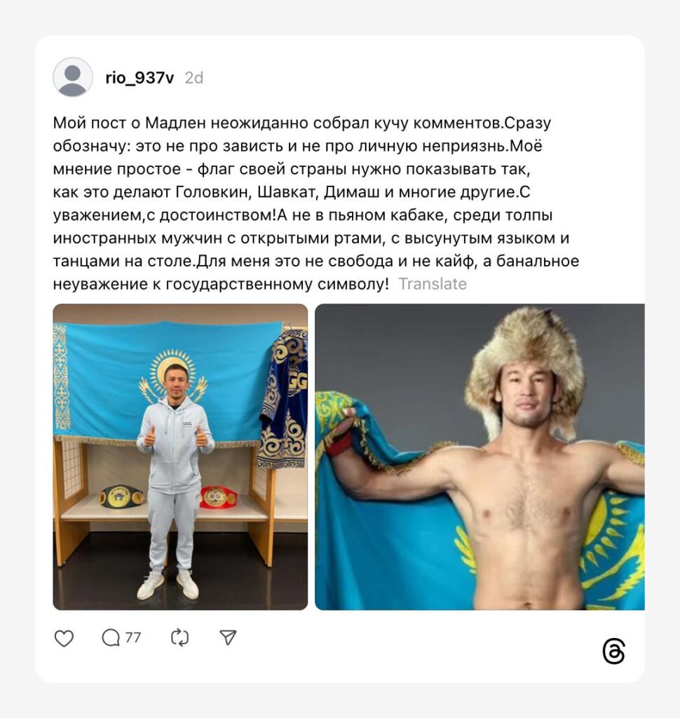 Большинство комментаторов решили уличить автора оригинального поста в зависти Мадлен. Кроме того, по их словам, как гражданинка Казахстана, блогерша может «махать флагом и в радости и в горе».