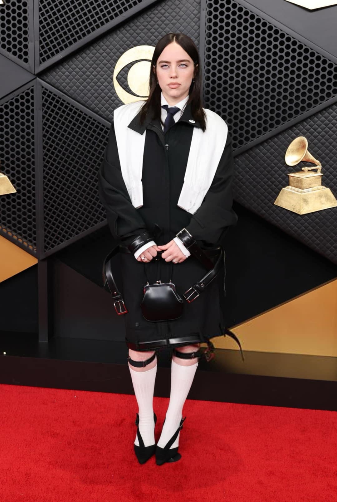 Билли Айлиш традиционно отходит от «типичных» платьев ковровой дорожки. Ее ансамбль с мужским кроем от Hodakova включал структурированный жакет, рубашку‑«биб», шорты и аксессуары.