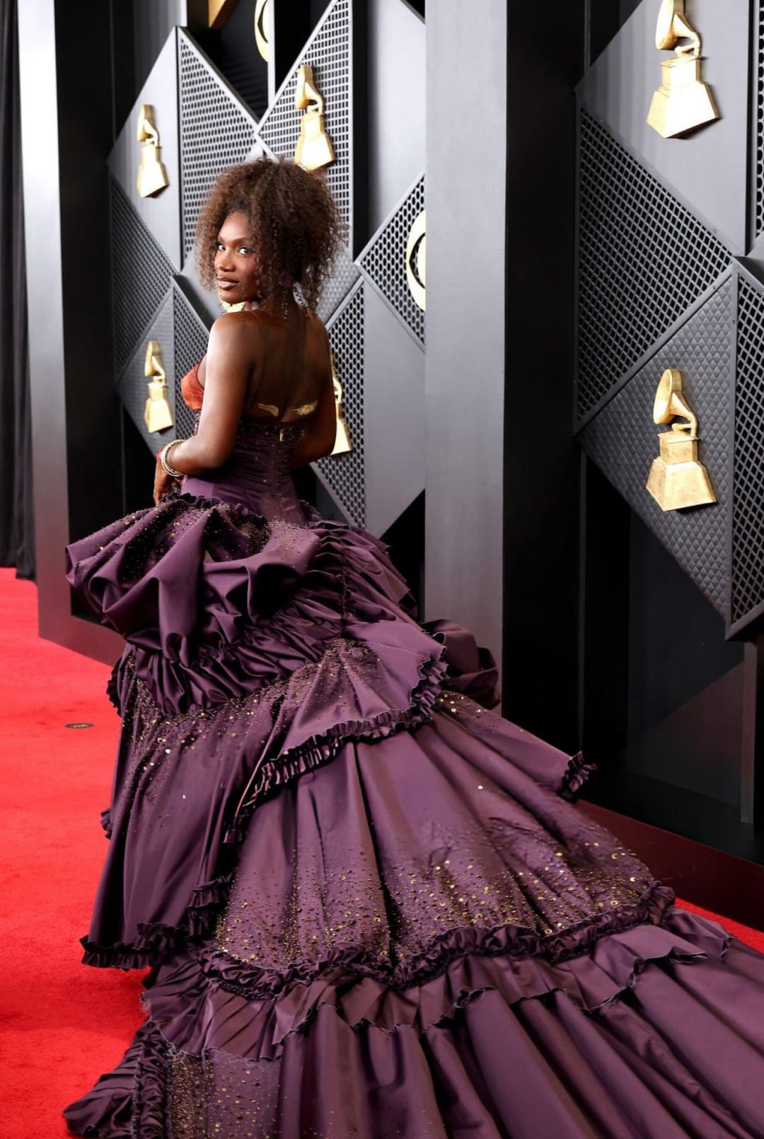 Рэперша Doechii предстала в пурпурном платье Roberto Cavalli с длинным шлейфом, медно‑бронзовым корсетом и сложной текстурой.