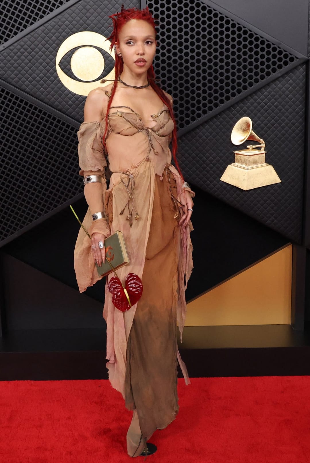 Известная яркими выходами FKA twigs выбрала воздушное платье Paolo Carzana в светлых оттенках с золотыми элементами и акцентом на красном.