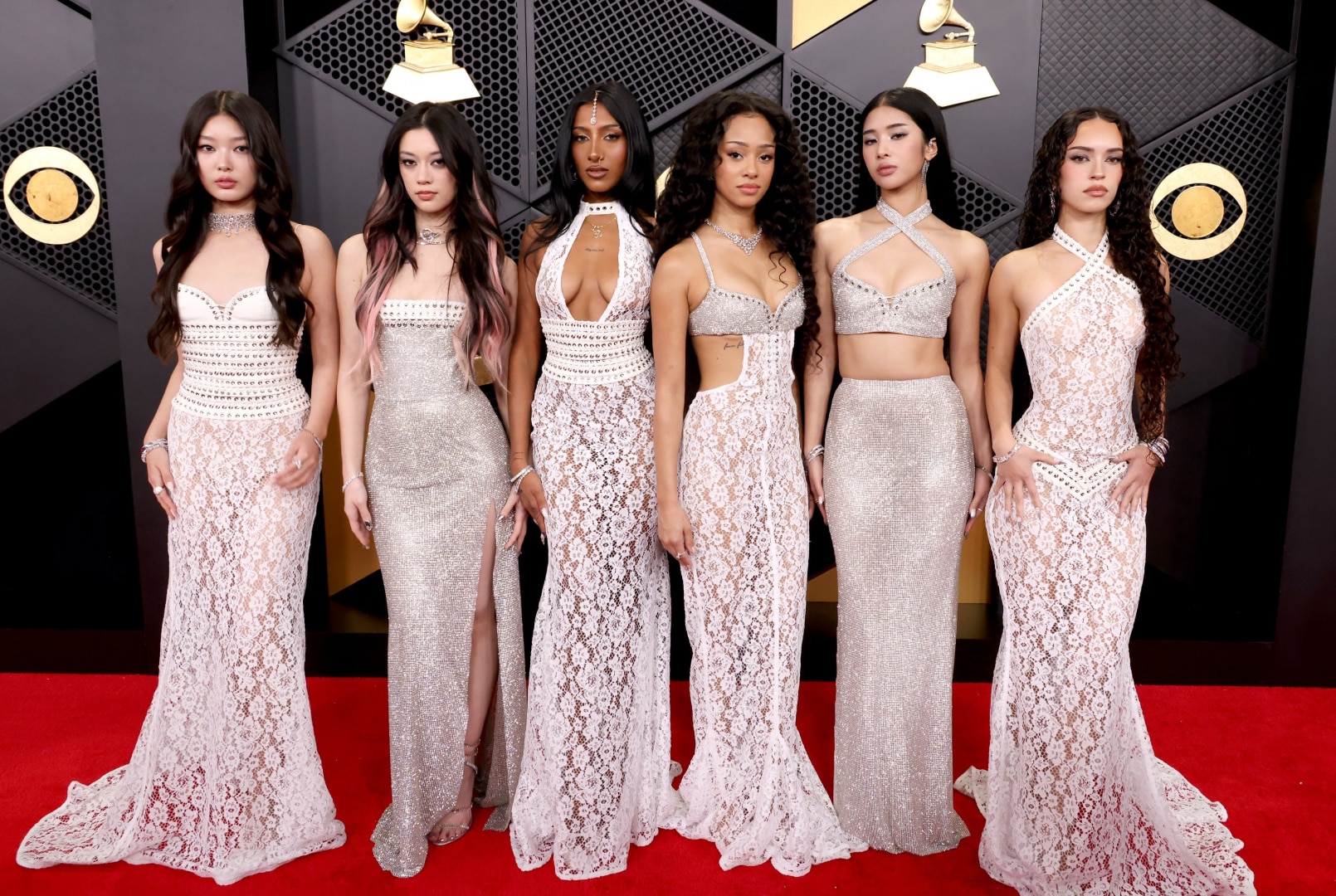 Герлз-бэнд Katseye появился на ковровой дорожке в координированных кружевных платьях от Ludovic de Saint Sernin. Каждое платье немного отличалось, но вся группа выглядела цельно. Однако фанатам из СНГ кружевные платья могли напомнить вязанные салфетки на телевизорах.