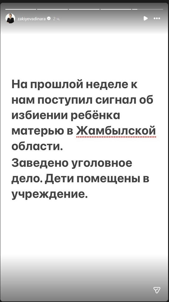 «На прошлой неделе к нам поступил сигнал об избиении ребенка матерью в Жамбылской области. Заведено уголовное дело. Дети помещены в учреждение», — заявила он.