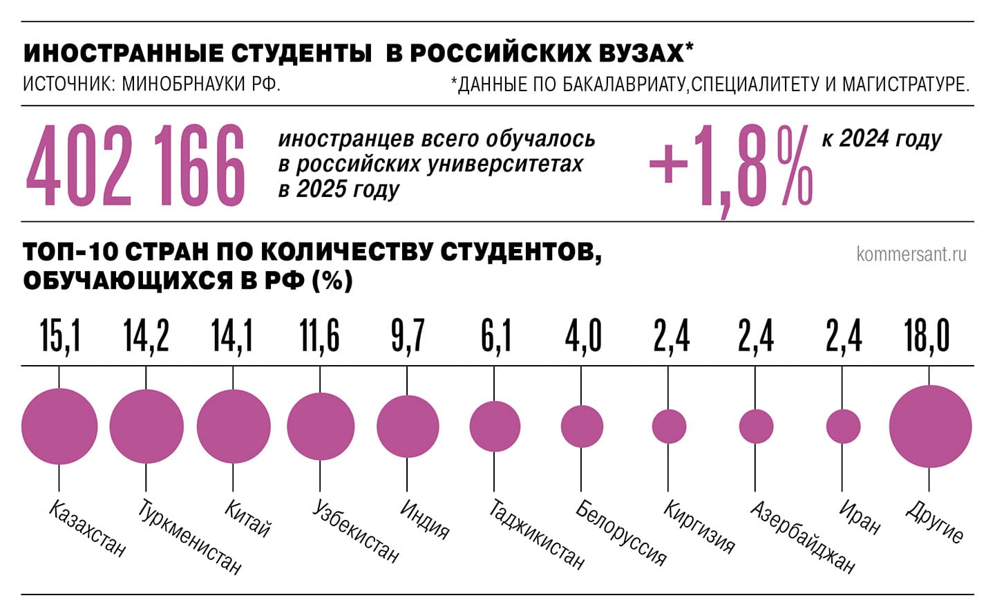 Доля иностранцев среди студентов российских вузов по итогам 2025 года достигла 8,5%, или 400 тыс. иностранных студентов, среди них более 15% – из Казахстана, далее следуют Туркменистан, Китай.