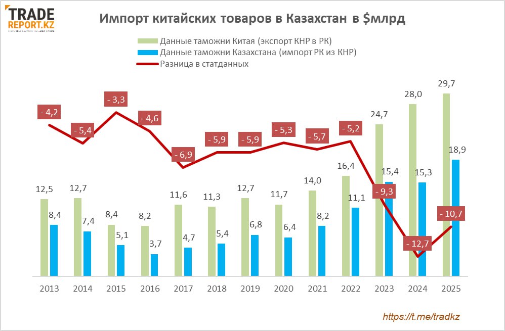 Таким образом, разница между китайской и казахстанской статистикой достигла $10,8 млрд. Формально это меньше, чем в 2024 году, когда разрыв составлял $12,7 млрд, а в 2023 году – $9,3 млрд.