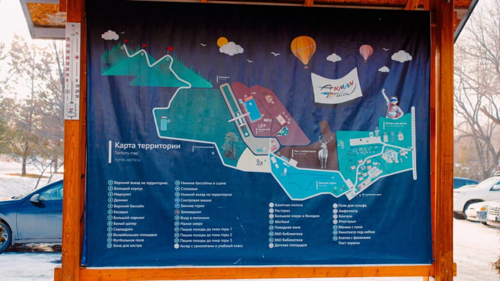 Комплекс расположен в предгорьях у Каскелена, в часе езды из центра Алматы (без пробок — прим.ред).