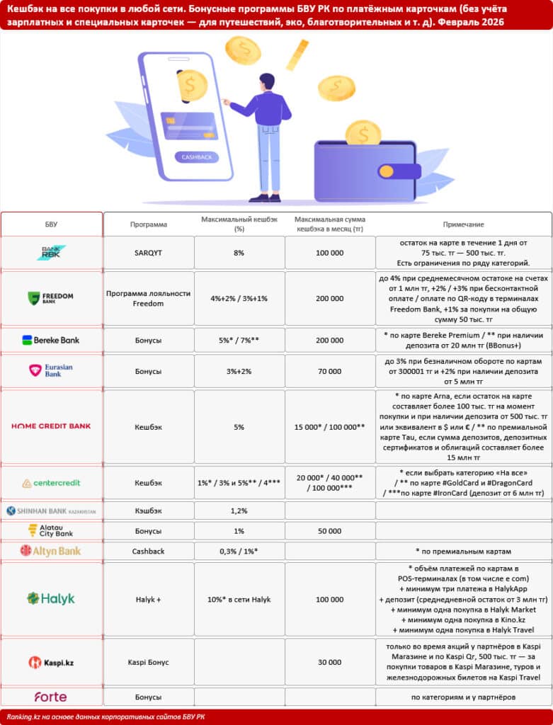 Программы кешбэка стали одним из главных критериев выбора банка для казахстанцев. Сейчас бонусы за покупки возвращают 12 из 23 банков страны, причем девять из них дают кешбэк на любые покупки в любой торговой сети, сообщает Ranking.kz. Однако условия везде разные – от простых до очень сложных. Разбираемся, кто предлагает самые выгодные программы лояльности и что за ними скрывается.