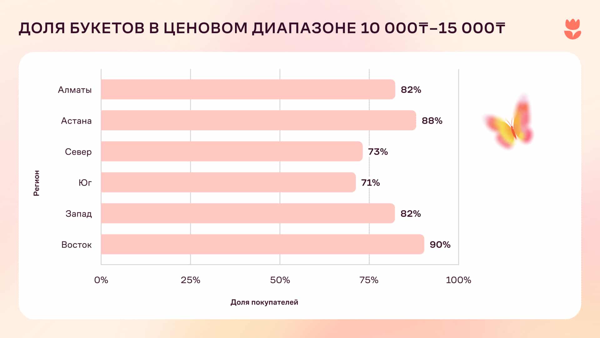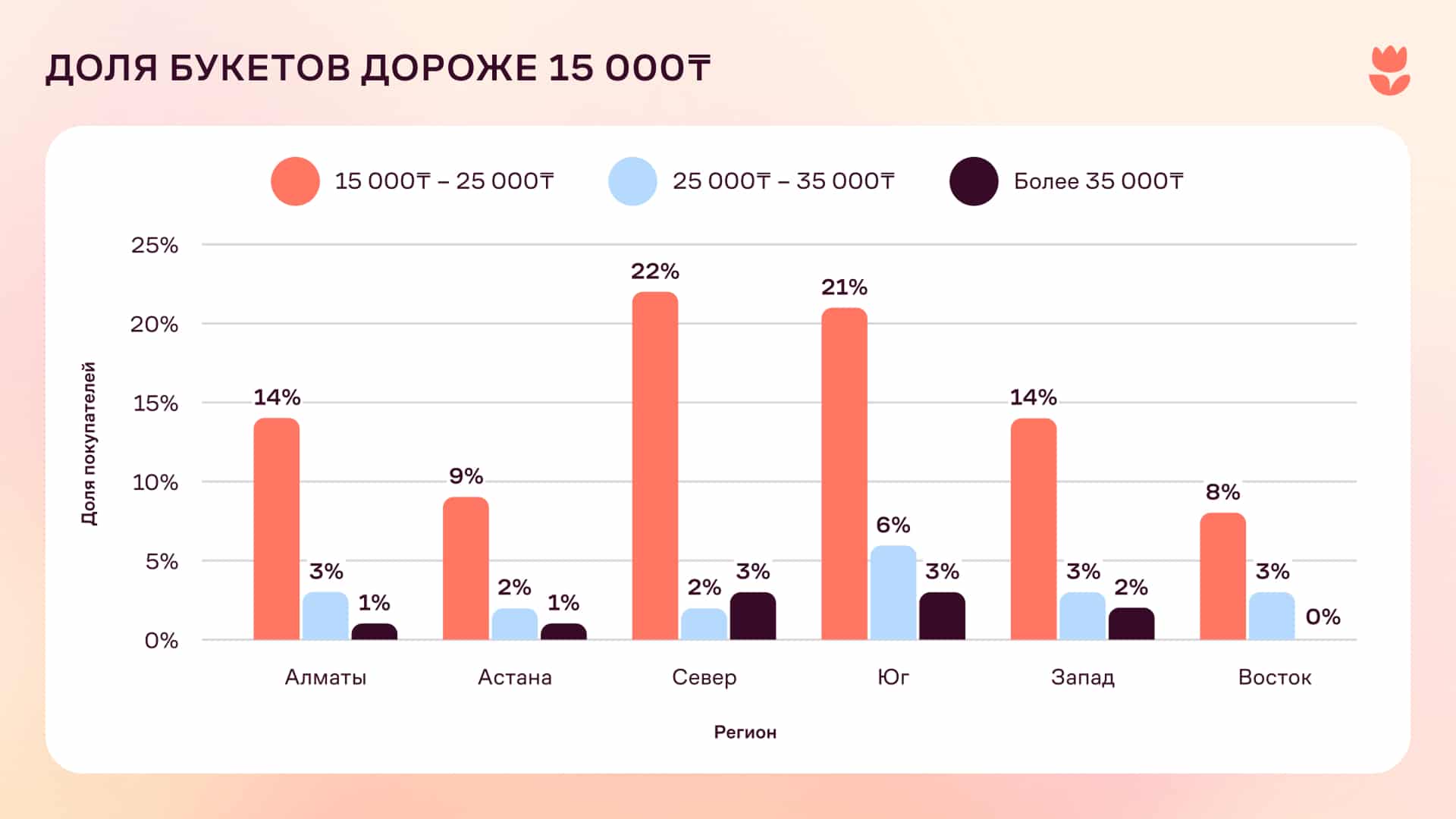 Потратить на цветы более 25 000 тенге готовы лишь 3% казахстанцев. Еще меньше тратят больше 35 000 тенге — 1–2% в зависимости от региона.