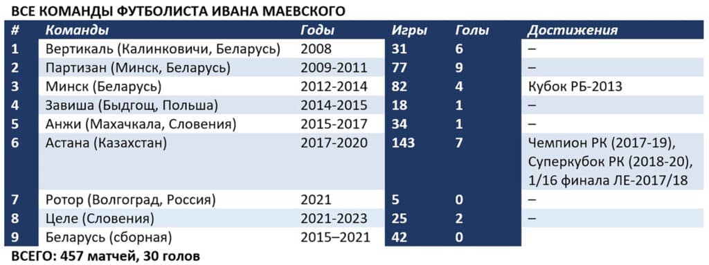 Наиболее весомых успехов футболист Маевский добился в составе нашей «Астаны». Техничный полузащитник, выполнявший на поле огромный объем работы, трижды становился чемпионом Казахстана и столько же раз выигрывал Суперкубок страны.