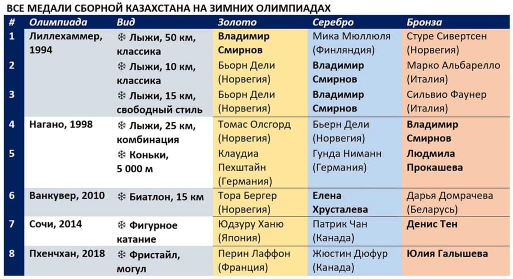 За восемь Белых Олимпиад периода независимости казахстанцы завоевали восемь медалей – одну золотую, три серебряные и четыре бронзовые. Единственным зимним казахстанским олимпиоником на сегодняшний день является лыжник Владимир Смирнов. Уроженец Щучинска выиграл для страны также два олимпийских серебра и бронзу. В его активе, кроме того, три золота чемпионата мира 1995 года и две высшие награды Зимней Азиады-1999.