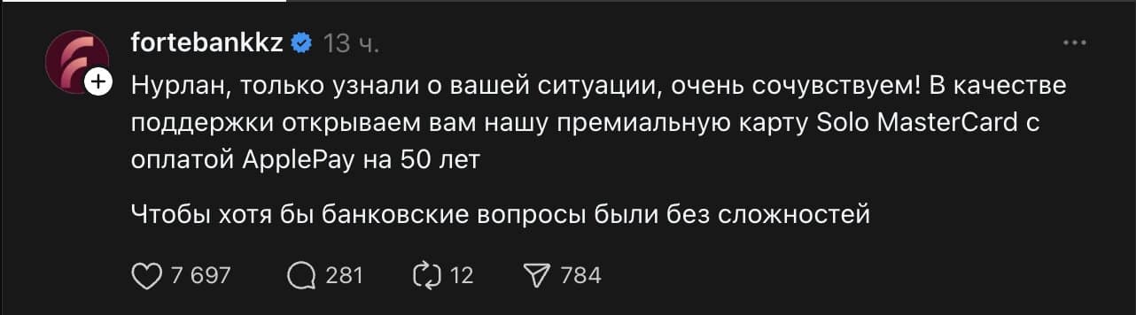 Неудачный ситуативный маркетинг ForteBank обернулся репутационным скачком. Банк попытался обыграть новость о том, что комику Нурлану Сабурову запретили въезд в Россию на 50 лет, предложив ему «в качестве поддержки» премиальную карту на тот же срок. Однако пользователи соцсетей сочли такой юмор неуместным, а тональность сообщения – издевкой.