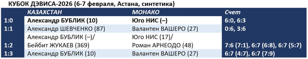 Александр Бублик, измочаленный почти трехчасовым парным матчем, проиграл своему злому гению Валантену Вашеро – 6:7 (4:7), 6:7 (7:9). Сборная Казахстана не справилась с Монако в домашнем матче Кубка Дэвиса – 1:3.
