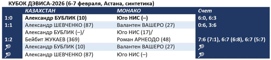 Александр Бублик в тандеме с Бейбитом Жукаевым проиграли драматичный парный поединок монегаскам Юго Нису и Ромену Арнеодо – 7:6 (7:1), 6:7 (6:8), 6:7 (5:7). Казахстан уступает в домашнем матче Кубка Дэвиса Монако – 1:2.