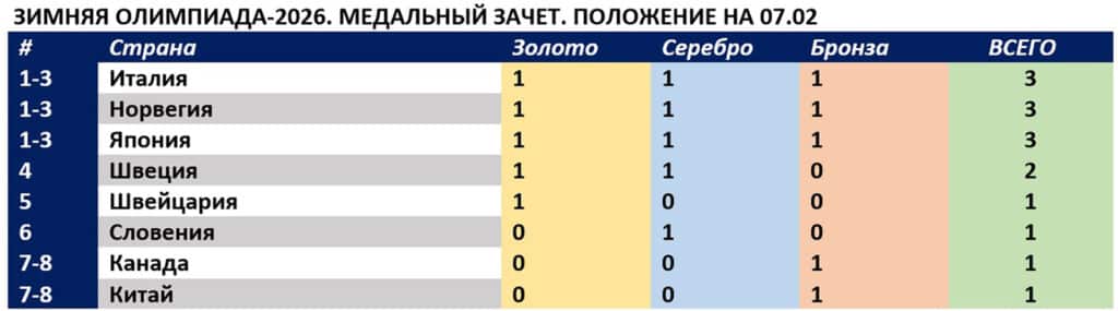 Кроме того, у Италии серебро (Джованни Франдзони) и бронза (Доминик Парис) в первом медальном виде программы – мужском скоростном спуске. А первое золото ОИ-2026 завоевал швейцарец Франьо фон Алльмен.