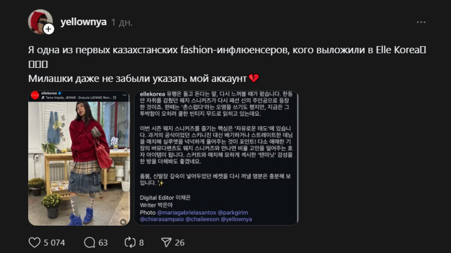 В публикации Elle Korea использовали ее образ, а также указали аккаунт, что особенно важно для блогеров.