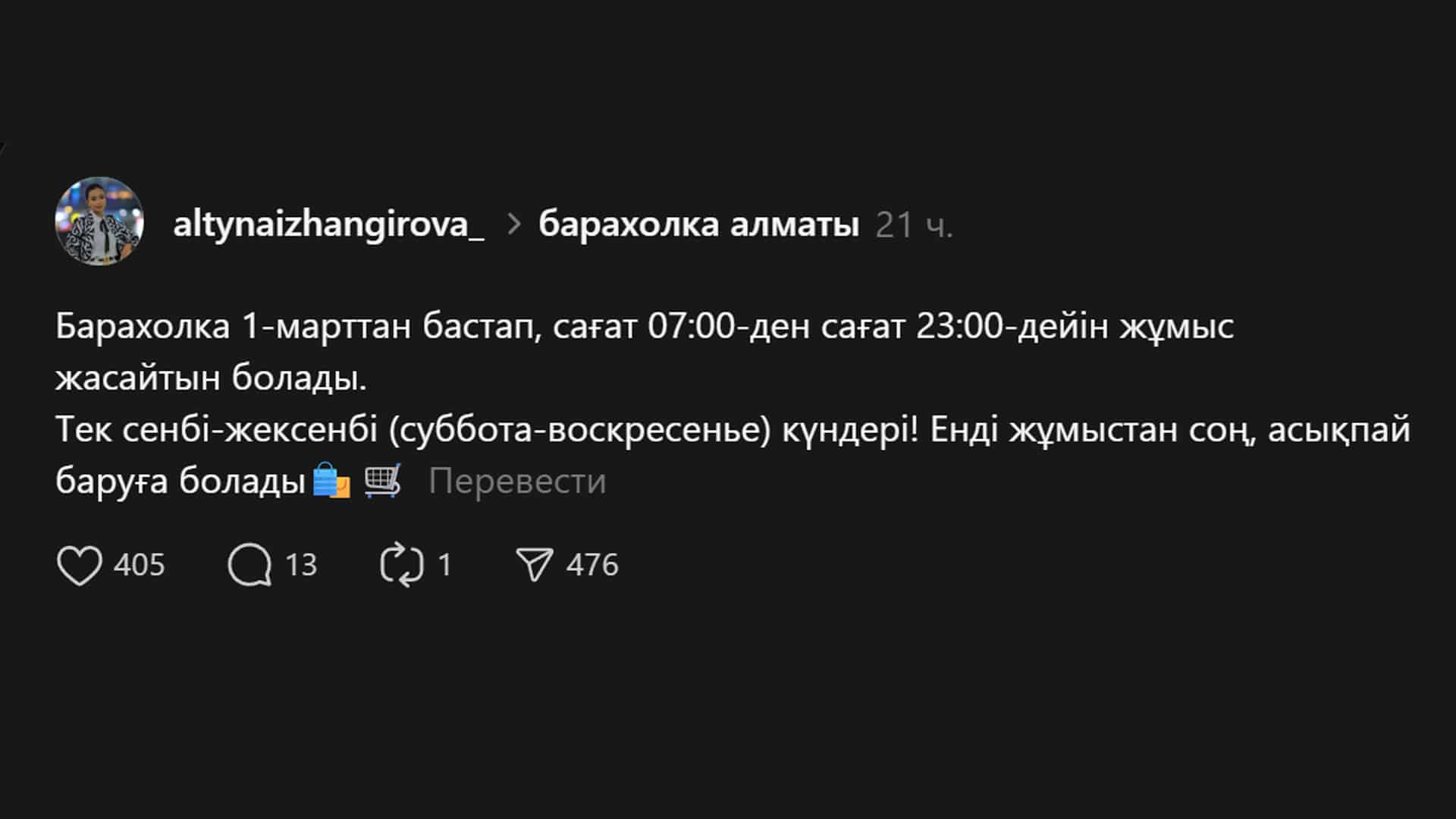 В соцсетях появилась информация о том, что алматинская барахолка якобы меняет график работы по выходным. Сообщается, что с 1 марта рынки будут работать с 7 утра до 11 ночи.