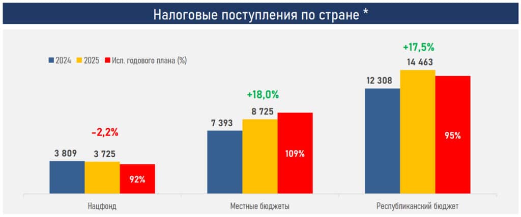 По данным АФК, в условиях ускорения экономической активности до 6,5% (против 5,0% годом ранее), ослабления среднего курса USDKZT на 11,4% и усиления налогового администрирования совокупные налоговые поступления (включая Нацфонд, местные и республиканский бюджеты) выросли двузначными темпами. По итогам года было собрано ₸26,9 трлн налогов против ₸23,5 трлн в 2024 году, что означает рост на 14,5% или ₸3,4 трлн.
