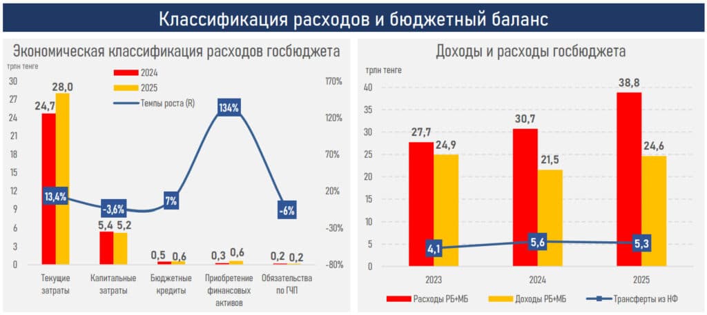 Расходы республиканского бюджета выросли на 7,9% или ₸2,6 трлн. Основной прирост пришелся на погашение займов (+₸751 млрд), социальную помощь и обеспечение (+₸604 млрд), а также трансферты (+₸432 млрд). В местных бюджетах расходы увеличились на 12,9% или ₸2,0 трлн, где наибольший рост отмечен в сфере образования (+₸495 млрд), ЖКХ (+₸320 млрд), транспорта и коммуникаций (+₸308 млрд).