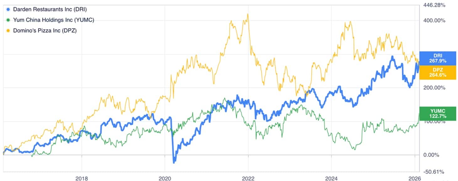 Вторая по популярности категория — рестораны. На них приходится около $6,3 млрд трат. Darden Restaurants управляет сетями Olive Garden и LongHorn Steakhouse, которые традиционно выигрывают от парного досуга.