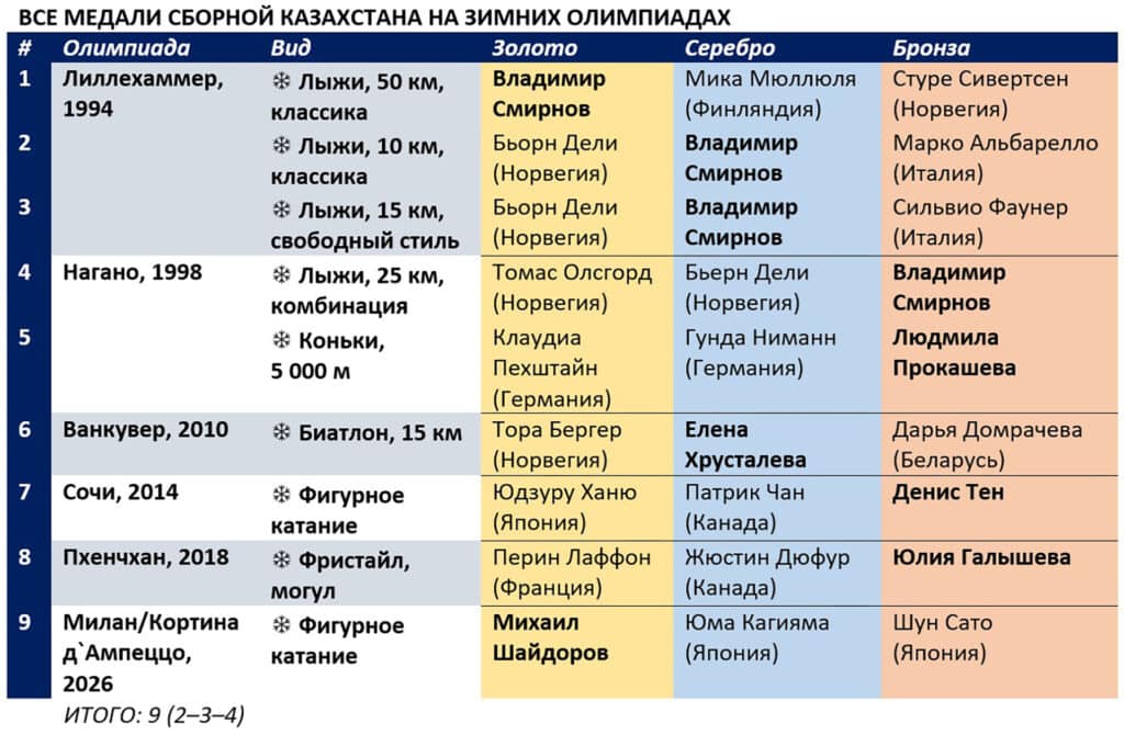 Золотая медаль Шайдорова – вторая в истории независимого Казахстана на Белых Олимпиадах. Первую в Лиллехаммере-1994 завоевал лыжник Владимир Смирнов. К слову, тогда же золото в мужском одиночном катании выиграл российский фигурист Алексей Урманов, наставник Шайдорова. А всего казахстанские спортсмены девять раз поднимались на пьедестал почета Зимних олимпийских игр.