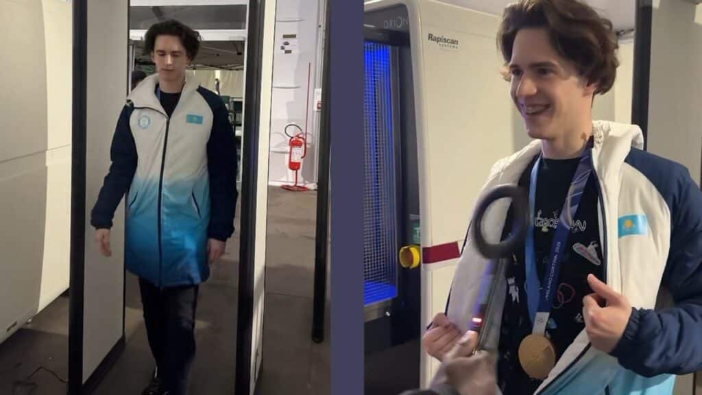 На кадрах спортсмен проходит через рамку металлоискателя, после чего демонстрирует свою золотую медаль, спрятанную под курткой сборной Казахстана. Ролик сопровождается подписью: «Тот писк? Просто олимпийское золото».