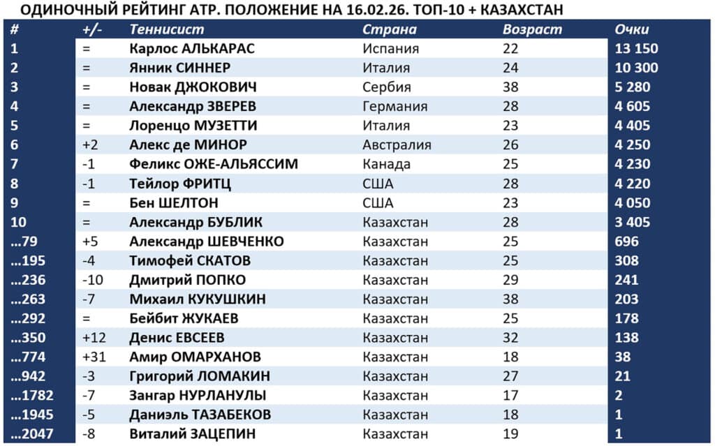 Александр Бублик сохранил за собой 10-е место в новом рейтинге ATP. На этой неделе казахстанец сыграет на пятисотнике в Дохе.