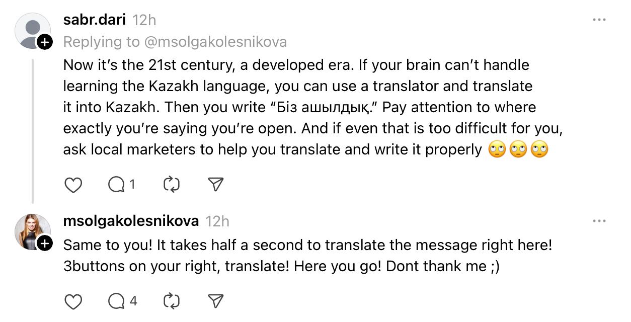 Некая Ольга Колесникова поделилась в Threads постом об открытии нового магазина. Публикация быстро стала вирусной в негативном ключе. Пользователей соцсетей возмутило, то что девушка продублировала сообщение на английском и русском, но не на казахском.